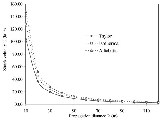 In Figure 14, it can be seen that shock velocity U calculated using Energy hypothesis for both adiabatic and isothermal flow are higher then the shock velocity obtained using Taylor′s relation. Near the point of explosion the difference in the two is quite large, which decreases sharply as the shock moves away from the point of explosion. It can be seen that shock velocity U calculated using Energy hypothesis for isothermal flow give more accurate results in comparison to the adiabatic flow.