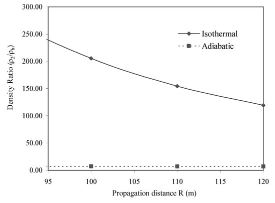 Comparison of density ratio (ρ2/ρh) obtained for the adiabatic and isothermal flow.