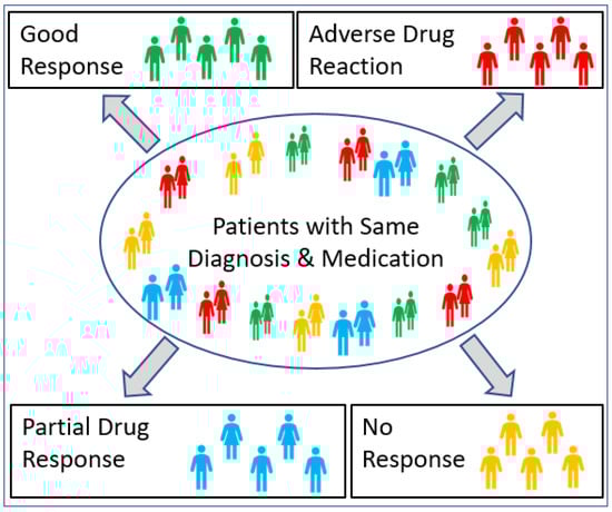 Adverse drug reactions (ADRs) are the fourth leading cause of death in the USA [] and account for 135K deaths per year with an economic burden of over USD 136 billion [,]. A systematic review of prospective studies showed that 5.3% of hospital admissions were associated with ADRs []. These are alarming statistics that illustrate the potential of widespread pharmacogenomic profiling to help mitigate some of these ADRs. More broadly, medical practice is moving away from the concept of “one size fits all” medications [], as drugs that help some patients will not work for others, and the same drug may have adverse effects in some patients (Figure 1).