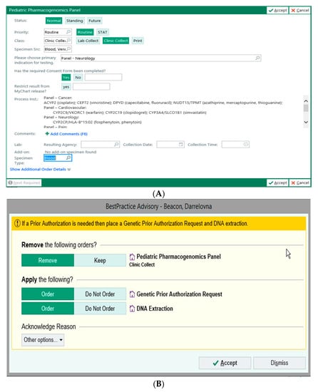 A significant impediment to the adoption of pharmacogenetics has been an inability to incorporate real-time physician education, CDS, and active ordering of PGx-directed genetic testing into the physician’s normal workflow in EPIC. Under the guidance of ACH, EPIC collaborated with Translational Software, Inc. (TSI) to import TSI’s rule set and curated recommendations into best practice advisories (BPAs). With this content enabled, physicians are prompted to consider PGx testing as per pre-alerts (Figure 2A,B) that are triggered by prescription orders of PGx relevant drugs.