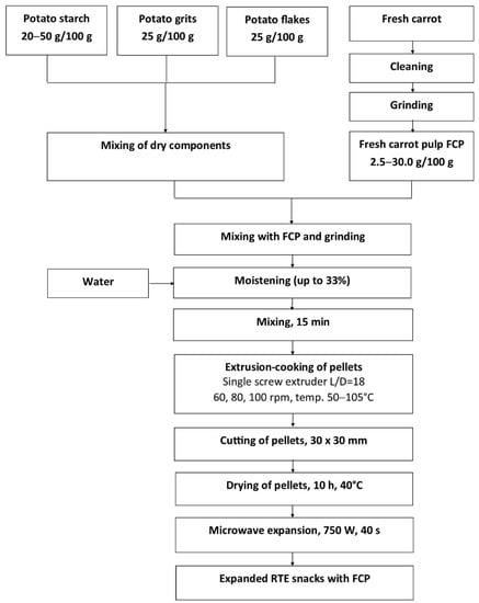 The properties of extruded snack pellets, with the addition of fresh carrot pulp, expanded by microwaving has not yet been subject to study. Plant material such as fresh carrot pulp seems to be a valuable source of biologically active components, as well as a natural colorant. Moreover, as was assumed by Lisiecka and Wójtowicz [], the application of fresh vegetable pulp is an efficient method to limit water and energy requirements during processing. Therefore, the present study is aimed at investigating the influence of the addition of varied fresh carrot content and variable screw speeds during processing on selected features of newly developed pellets and microwave-expanded snacks.