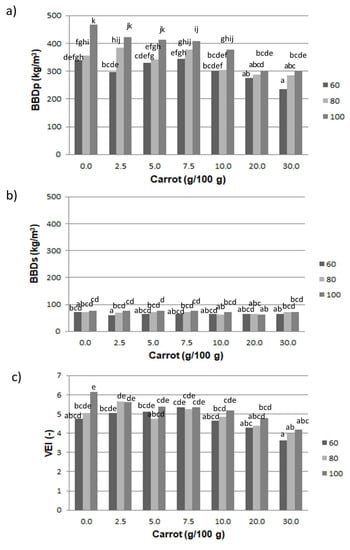 Microwave-expanded snacks with the addition of fresh carrot pulp had BBD values ranging from 58.79 kg/m3 (snacks with 2.5 g/100 g of carrot pulp at maximum rpm) to 76.93 kg/m3 (snacks with 5 g/100 g vegetable content at maximum screw speed). The bulk density of soybean-based RTE extrudates also increased with an increasing rotational screw speed during extrusion [], because of the high temperature-induced starch gelatinization, which makes it possible to obtain snacks with a lower density despite the use of increasing rpm, as shown by the production of brown rice extrudates. The low density is influenced by the breakdown of the protein and starch matrix under high shear forces []. Since the production of third-generation expanded snacks from starchy pellets involves the use of lower temperatures to avoid the boiling of the water present in the raw materials, and thus the direct expansion of the pellet strip, this outcome is most likely connected with the higher density and viscosity of the dough at increased applied rpm during processing, as is indicated by significant differences in the pellets’ bulk density when processed at the lowest and the highest screw speeds (Figure 2a).