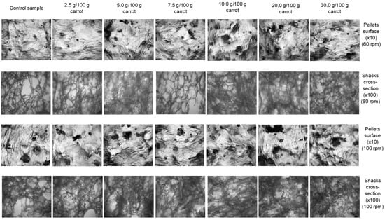Figure 3 shows the structure of fresh carrot pulp-supplemented pellet surfaces (×10 magnification), and cross-sections of the microwave-expanded snacks (×100 magnification), respectively. Microscopic observations confirmed the compact and glassy surface of pellets, indicating a good gelatinization of the extruded samples. Such an effect became more evident as the carrot pulp addition increased, and with this increase, vegetable particles could be seen on the surfaces and in inside the structures of the extruded pellets. Pellets processed at a higher screw rpm were less smooth on the surface, especially when high amounts of vegetables were added, as shown in Figure 3. On observing the cross-section of microwave-expanded snacks, we found a porous inside structure with empty cells that increased in quantity, yet had dimensions that decreased in size with the increased level of fresh carrot pulp in the recipe. Nevertheless, all the tested snack pellets supplemented with fresh carrot pulp successfully underwent microwave expansion. This increased level of vegetable additive made the inside structure denser and limited cell size, as was confirmed by the VEI results.