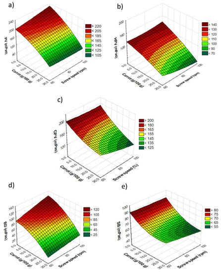 The pellet PV was strongly negatively correlated with the amount of additive (r = −0.84), the AA and the a* color coordinate of pellets (r = −0.82 and −0.83), and strongly positively correlated with the VEI (r = 0.83), HPV (r = 0.94), CPV (r = 0.81) and BD (r = 0.97) of pellets, and PV (r = 0.84), HPV (r = 0.91), CPV (r = 0.90) and SB (r = 0.83) of the expanded snacks. The lowest PV value was 85 mPas, and was observed for snacks made from pellets with the lowest PV. The highest PV value (201 mPas) was recorded for the snack with 5.0 g/100 g pulp content processed at the lowest screw speed. For RTE snacks, the lowest PV values were recorded for samples produced at 80 rpm, with a fresh carrot level of 5.0 g/100 g and above (Figure 5a). The PV of snacks was strongly negatively correlated with the amount of additive (r = −0.94), the TPC of pellets (r = −0.86) and snacks (r = −0.85), the AA of pellets (r = −0.88) and snacks (r = −0.86), the a* coordinate of pellets (r = −0.91) and a* and b* of expanded snacks (r = −0.84 and −0.85, respectively). Negative correlation was noted between the PV of snacks and the VEI (r = 0.82), pellet lightness (r = 0.81), HPV (r = 0.91), CPV (r = 0.87), and snacks SB (r = 0.85).