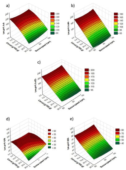 Hot paste viscosity (HPV) indicates the sensitivity of the swollen starch granules to the shearing forces. The HPV values were within the range of from 77 mPas (pellets with the maximum additive content, processed at the maximum rpm) to 163 mPas (pellets with 10.0 g/100 g addition, extruded at 60 rpm) for carrot-supplemented pellets (Figure 4b). HPV was also strongly positively correlated with pellet CPV (r = 0.89), BD (r = 0.86) and SB (r = 0.81), and with supplemented snack HPV (r = 0.86) and CPV (r = 0.86). The HPV of microwave-expanded snacks was similar, and ranged from 65 mPas (maximum additive content, extruded at 80 rpm) to 172 mPas (control sample, made at 60 rpm) (Figure 5b).