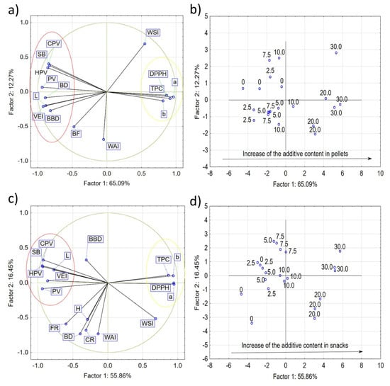 Principal component analysis (PCA) is one of the most common statistical data reduction methods. Principal component analysis (Figure 6) was carried out in order to identify the differences in pellets and microwave-expanded snacks supplemented with fresh carrot pulp, processed at various rpm. PCA made it possible to select the discriminants that had the greatest impact on the differences between samples. The analysis itself consists of determining the component variables that are a linear combination of many examined features. The evaluation of the PCA graph (Figure 6a) shows that there is a strong but negative correlation between the parameters from the yellow ellipse and the parameters from the red ellipse. These parameters have the greatest influence on the system variability and describe the PC1 parameter. In the case of pellets, the first component of PC1 explained 65.09% of the variability of the results, and is positively related to TPC, AA, and the pellet a* and b* color coordinates. In contrast, it was negatively related to the BBD, the VEI, the lightness and the parameters describing pasting properties. In turn, the WAI and WSI are negatively correlated to each other. They also have a significant impact on the system variability and describe the second main component of PC2 in 12.27% of the results (highly negatively related to the WAI, and positively related to pellet WSI). There is no correlation between WAI and the parameters contained in the yellow and red ellipses. There is also a weak positive correlation between the WSI and the parameters in the yellow ellipse, and a weak negative correlation between the WSI and the parameters in the red ellipse. Additionally, there is a negative correlation between the WSI and CF. The location of the samples next to each other on the chart (Figure 6b,d) shows that the features are similar, and the distance between them indicates the nature of the differences. After placing the samples in the vicinity of the first two components (Figure 6b), it is evident that the samples differ from each other in terms of the carrot addition level. Moreover, significant differences can be seen at the supplementation levels of 20.0 and 30.0 g/100 g in relation to the lower levels of fortification. From this graph, it can be concluded that the first major component describes the system variability and determines the content of the additive to 65.09%. In the case of microwave-expanded snacks, the first component (Figure 6c) explains 55.86% of the variability of the results, and is positively related to TPC, AA, color coordinates a* and b* values, and negatively related to the snack VEI, L* and PV, HPV, CPV and SB. We can also conclude that there is a strong but negative correlation between the parameters from the yellow ellipse and the parameters from the red ellipse. The parameters contained in these ellipses have the greatest influence on the system variability when assessing the expanded snacks.