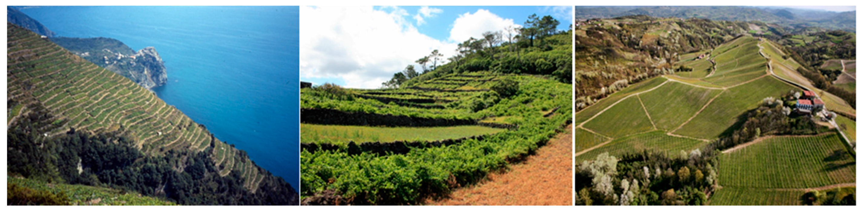 Three viticultural landscapes, IT-Ti (left), PT-Pi (center) and IT-Vp (right), recognized as cultural heritage by UNESCO.