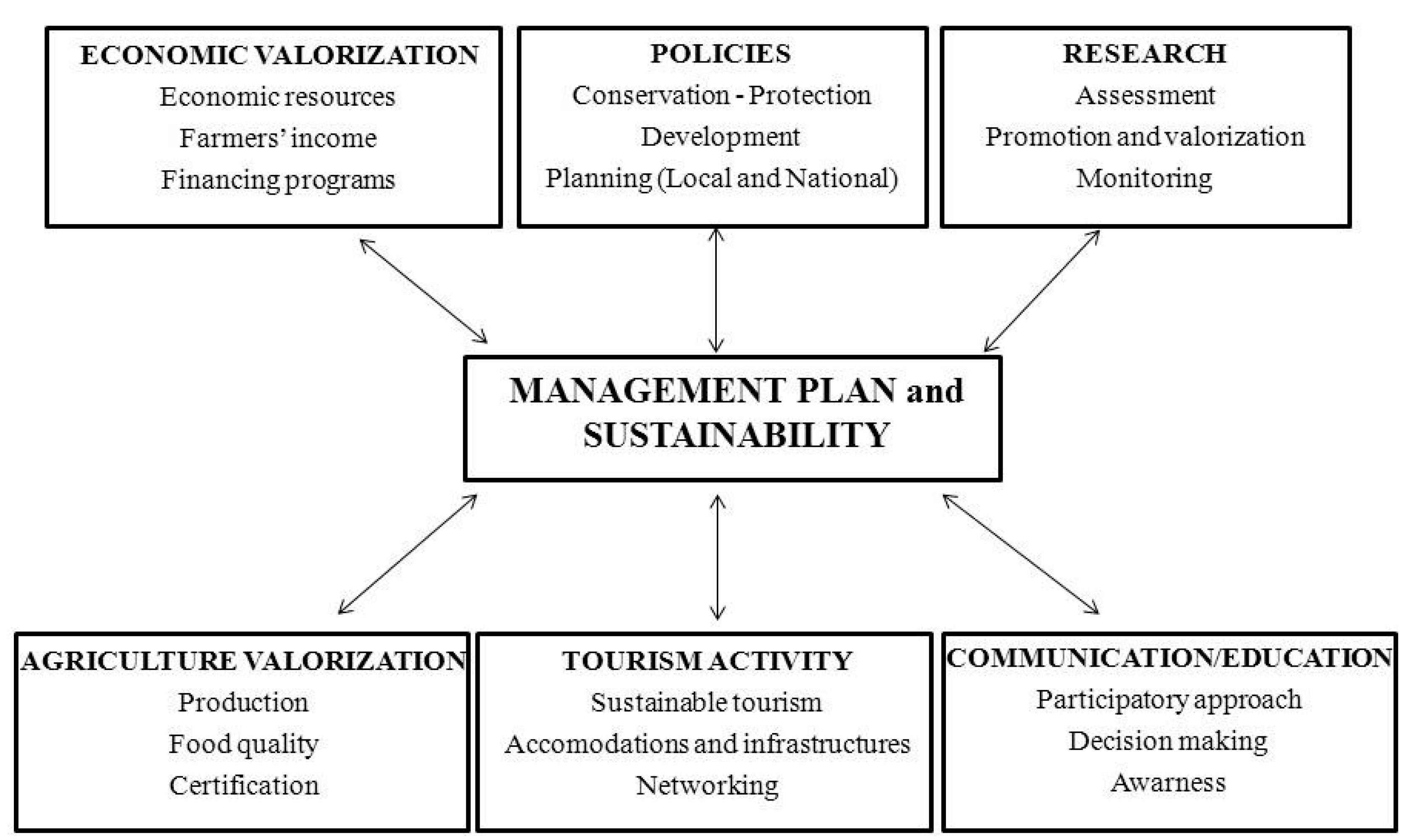 With the aim to conserve and maintain agriculture, nature and landscape features, several strategies were developed. To ensure the sustainability of the rural World Heritage Sites, it is essential to guarantee the necessary resources to sustain the implementation of the Convention concerning the Protection of the World Cultural and Natural Heritage (1972) and MP through operational arrangements. From the analyses of the strategies/actions applied by each rural World Heritage Site, we identified six types of operational arrangements. Economic and agricultural valorization, relevant policies, tourism activity, communication/education and research were recognized as strategic keys for the management plan (Figure 3).