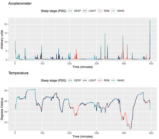 The Oura ring has a negative temperature coefficient (NTC) thermistor (non-calibrated, resolution of 0.07 degrees Celsius) as its temperature sensor. The sensor has been programmed to register skin temperature readings from the palm side of the finger base every 10 s. First, we aggregated temperature data into epochs of 30 s, to be consistent with sleep staging. Second, an artifact rejection step is applied, in which values outside the range of 31–40 degrees Celsius are masked. Third, the following features are calculated: mean, min, max, and standard deviation. An example accelerometer and temperature features are shown in Figure 2.