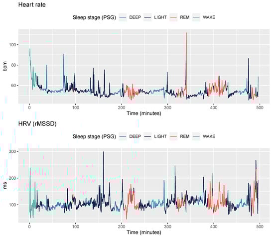 Heart rate and HRV (rMSSD) data for one participant (Dataset 1: Singapore, 15 years old) and one night. Sleep stages annotated from PSG data are color-coded.