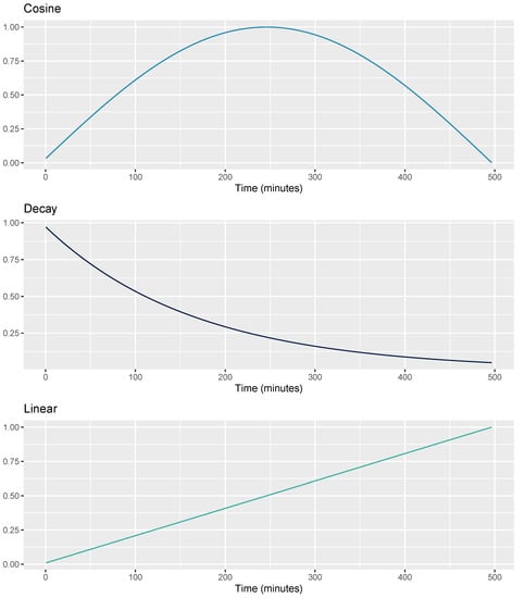 Sleep is a dynamic process regulated by many internal and external factors. According to the traditional two-process model of sleep [,], there are two main components that determine the time when we go to sleep and the time when we wake up, as well as the overall structure and depth of our sleep. These two components are the circadian rhythm and homeostatic sleep drive. The circadian rhythm promotes sleep at night and wakefulness during the daytime. This wave-like rhythm has an internal 24-h period, which is synchronized by external timing cues, such as sunlight. The homeostatic sleep drive refers to how the pressure for sleep linearly builds up in our brain during wakefulness, and decreases in an exponential manner during sleep, and especially deep NREM sleep. We have added three sensor-independent features to capture these two components, a cosine function, an exponential decay, and a linear function. The cosine function represents the circadian drive component [,]. The second feature represents the decay of homeostatic sleep pressure across the night, most dramatically during the first hours of sleep which are rich in deep NREM sleep. The third feature is the time elapsed since the beginning of the night, as a linear function ranging from 0 to 1. The goal of this feature is to take into account the well-known asymmetry of sleep stages across a typical night of sleep (i.e., more deep NREM early in the night, and more REM sleep in the last hours of the night). Sensor-independent features were computed using as parameter the duration of each individual night of sleep, as sleep staging is performed only at the end of the night. An example of these three features is shown in Figure 4.