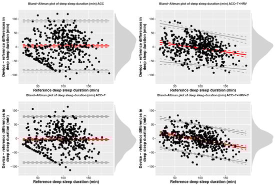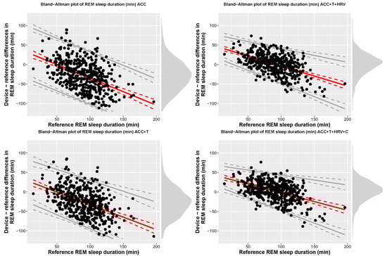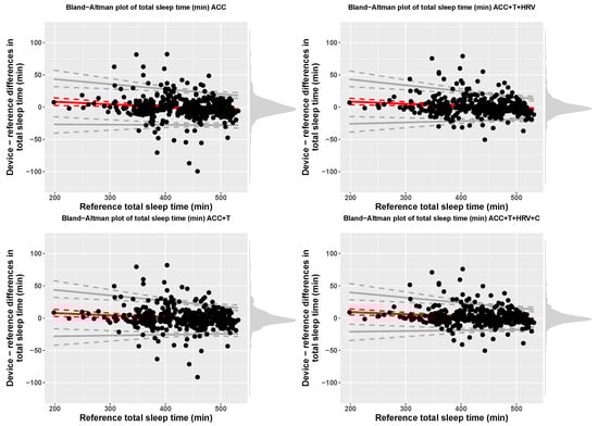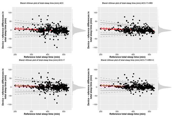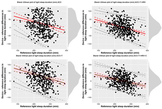 Accuracy for 4-stage detection (sleep, wake) was 57% (f1-score = 0.68), for accelerometer-based models, while including temperature resulted in 60% accuracy (f1-score = 0.69), including HRV features resulted in 76% accuracy (f1-score = 0.73), and, finally, adding circadian features, led to 79% accuracy (f1-score = 0.78). At the group level, Table 3 reports TST, time in light, deep, and REM sleep for each model, including bias and limits of agreement. Figure 7, Figure 8, Figure 9 and Figure 10 show Bland-Altman plots of the four models for TST, light, deep, and REM sleep.