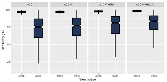 In Figure 6, we report epoch by epoch sensitivity for sleep and wake and the four models compared in this paper. Sensitivity is also reported in Table 2. Since we are dealing with 2-stage classification, specificity for wake is the same as sensitivity for sleep and, therefore, is not reported separately.