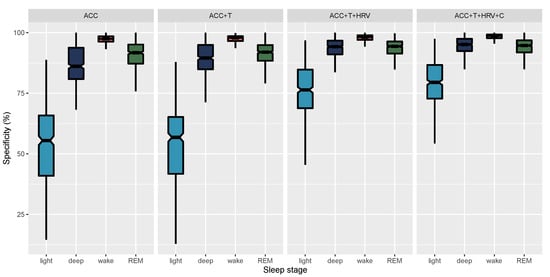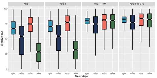 Given the high sensitivity and specificity for each individual stage, the proposed method might be able to better track individual changes in sleep patterns over time, with respect to currently available sensors and algorithms, which tend to detect accurately only one or two of the four stages [,,].