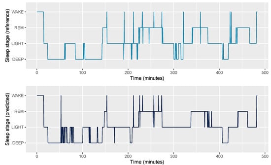 Machine learning models were evaluated using a 5-fold cross-validation and a standardized framework for sleep stage classification assessment []. According to the proposed framework, we report for all models and both 2-stage and 4-stage classification the time spent or estimated in each sleep stage, as well as Bland-Altman plots. We also report sensitivity and specificity for epoch by epoch analysis of each individual sleep stage. In addition to the standardized framework, we report the f1 score as an additional performance metric. The f1 score provides a better overview of the classifier performance in multiclass classification with imbalanced data, which is the case for sleep stage detection (i.e., light sleep is far more frequent than deep sleep, REM sleep, or wake). All analyses were performed in Python 3.8 using the pandas, numPy, scikit-learn, and seaborn packages. In addition, the R script provided in Reference [] was used to generate Bland-Altman plots and other results according to the standardized validation framework.