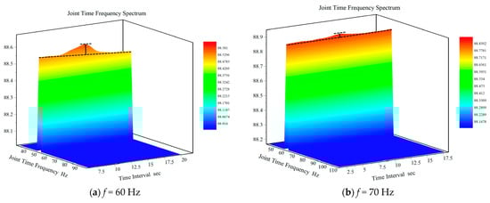 The JTFS of experiment results for the first orientation of the copper cone in different excitation frequencies (60 Hz, 70 Hz, 80 Hz, and 90 Hz) is shown in Figure 9. From Figure 9, we found that the DFDZ of the first orientation of the copper cone was 70–80 Hz, thus we took 75 Hz as the FIP. We used the same method to scan and detect the second orientation of the copper cone and found that the DFDZ of the second orientation of the copper cone was 70–80 Hz, thus 75 Hz was taken as the FIP. By comparing the DFDZs of the two orientations of the triangular pyramid above, it was concluded that the AIFCs of the underwater electric field of the object in different orientations were different (that is, DFDZ and FIP are different in each orientation). This difference is caused by the different surface characteristics of the object.