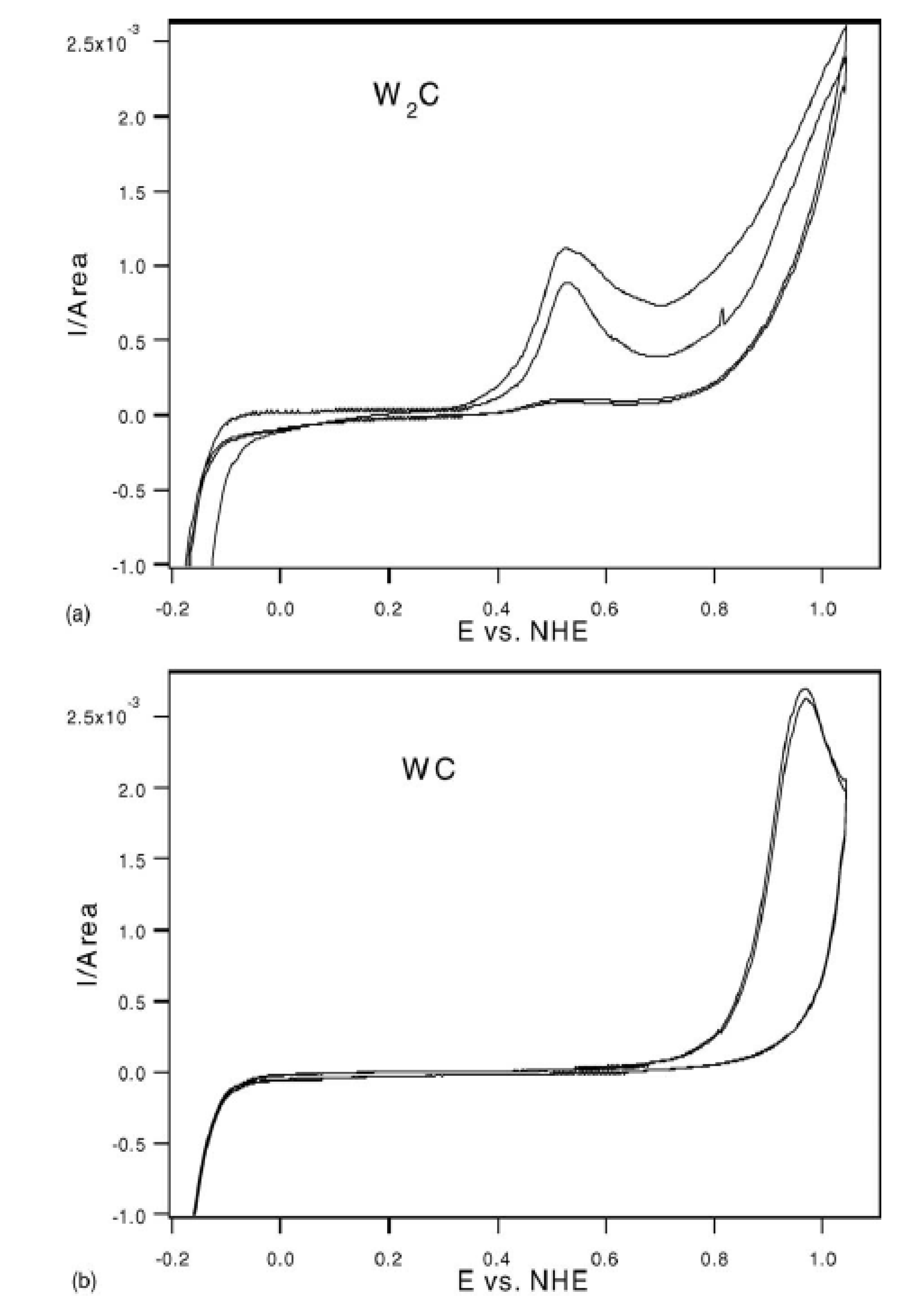 Among the metal carbides, tungsten carbides have been widely applied in the electrochemical systems including the electrocatalyst for low temperature fuel cells. This is due to its surface reactivity resembling that of platinum and stability in acidic medium. Tungsten carbides have several phases like tungsten mono-carbide (WC), tungsten semi-carbide (W2C) and cubic tungsten carbide (WC1-X). Among the various tungsten carbide phases, WC is known to be the most stable phase. Chen et al. reported that WC was more stable than W2C under anodic potential range [66]. As shown in Figure 2, W2C led to the anodic current peak at lower anodic potential (between 0.4 V and 0.6 V vs NHE) than WC (above 0.6 V vs NHE) in 0.5 M H2SO4 electrolyte. Furthermore, this anodic current at lower potential indicates that W2C is more easily oxidized than WC, and implies that loss of W2C can occur in fuel cell application. In addition, W2C showed higher corrosion current than WC at the same potential [67].
