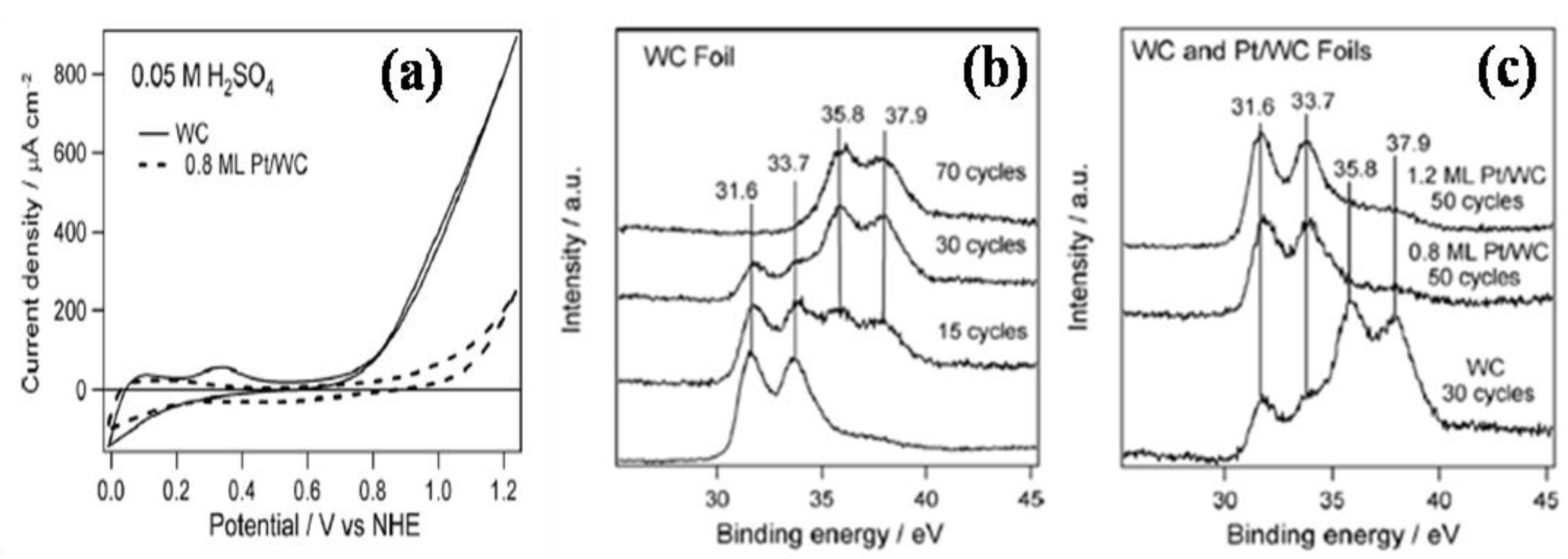 As shown in Figure 3, the electrochemical stability of pure and Pt modified WC foil has been studied before and after CV with XPS analysis [76]. Pure WC was completely changed to WxOy species during 70 repeated CV cycles from –0.09 V to 1.241 V (vs NHE) performed in 0.05 M H2SO4 electrolyte. However, in case of Pt modified WC, WC phases were conserved well after 50 cycles CV measurement. This enhanced electrochemical stability was also observed in CV results. The corrosion current density of Pt modified WC was dramatically reduced at the anodic corrosion region. In addition, onset potential of corrosion of Pt modified WC was observed at ~1.0 V, higher than that of pure WC at ~0.8 V (vs NHE). Furthermore, this research group studied the electrochemical stability of pure and Pt modified Mo2C foil with same analysis. Unlike WC, the electrochemical stability of Pt modified Mo2C was not enhanced by Pt. However, the Mo2C phase remained intact after CV measurement carried out at acidic media [76]. This result implies that Mo2C has the intrinsic stability without aid of other metals, and the onset potential for corrosion was ~0.3 V (vs NHE).