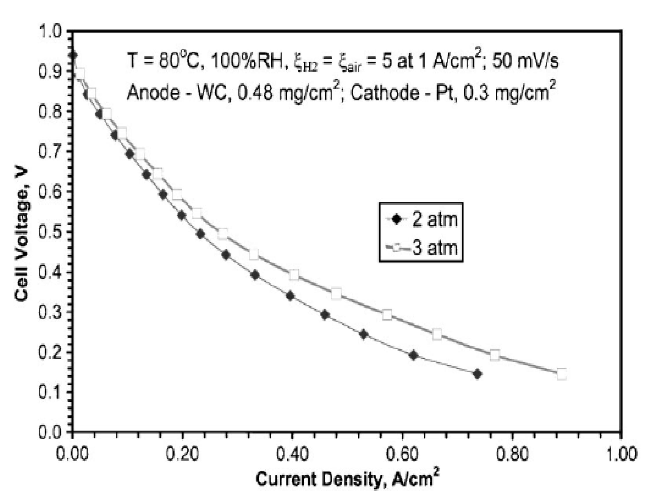 Polarization curves of the tungsten carbide-based anode in a 5 cm2 single cell with fully humidified H2 / air at flow rates of 0.2/0.5 slpm and 80 °C (Reprinted from Reference 86 with permission).