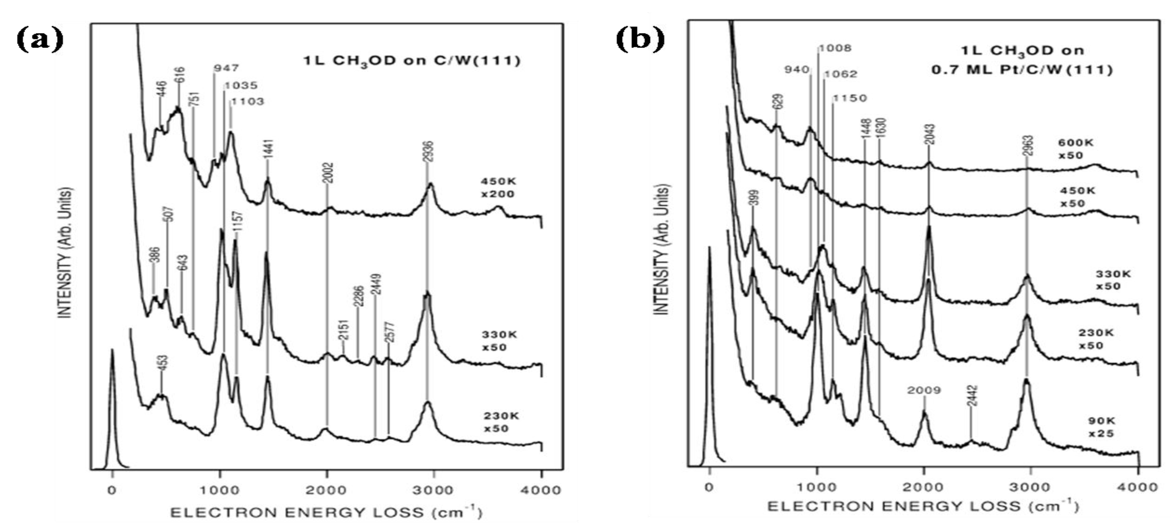 HREEL spectra monitoring thermal properties of 1.0 L CH3OD adsorbed on (a) pure C/W(111) and (b) 0.7 ML Pt/C/W(111). (Reprinted from Reference 88 with permission).