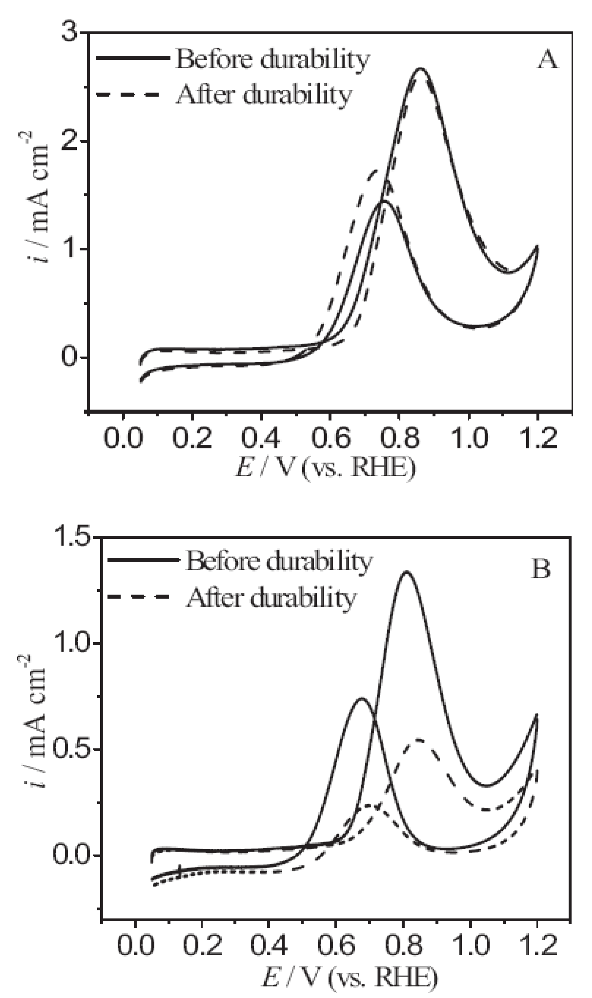 CV traces of methanol electro-oxidation on (A) PtNiPb/WC and (B) PtNiPb/C catalysts in a solution of 0.5 M CH3OH and 0.5 M H2SO4 before and after accelerated durability test (Reprinted from Reference 91 with permission).
