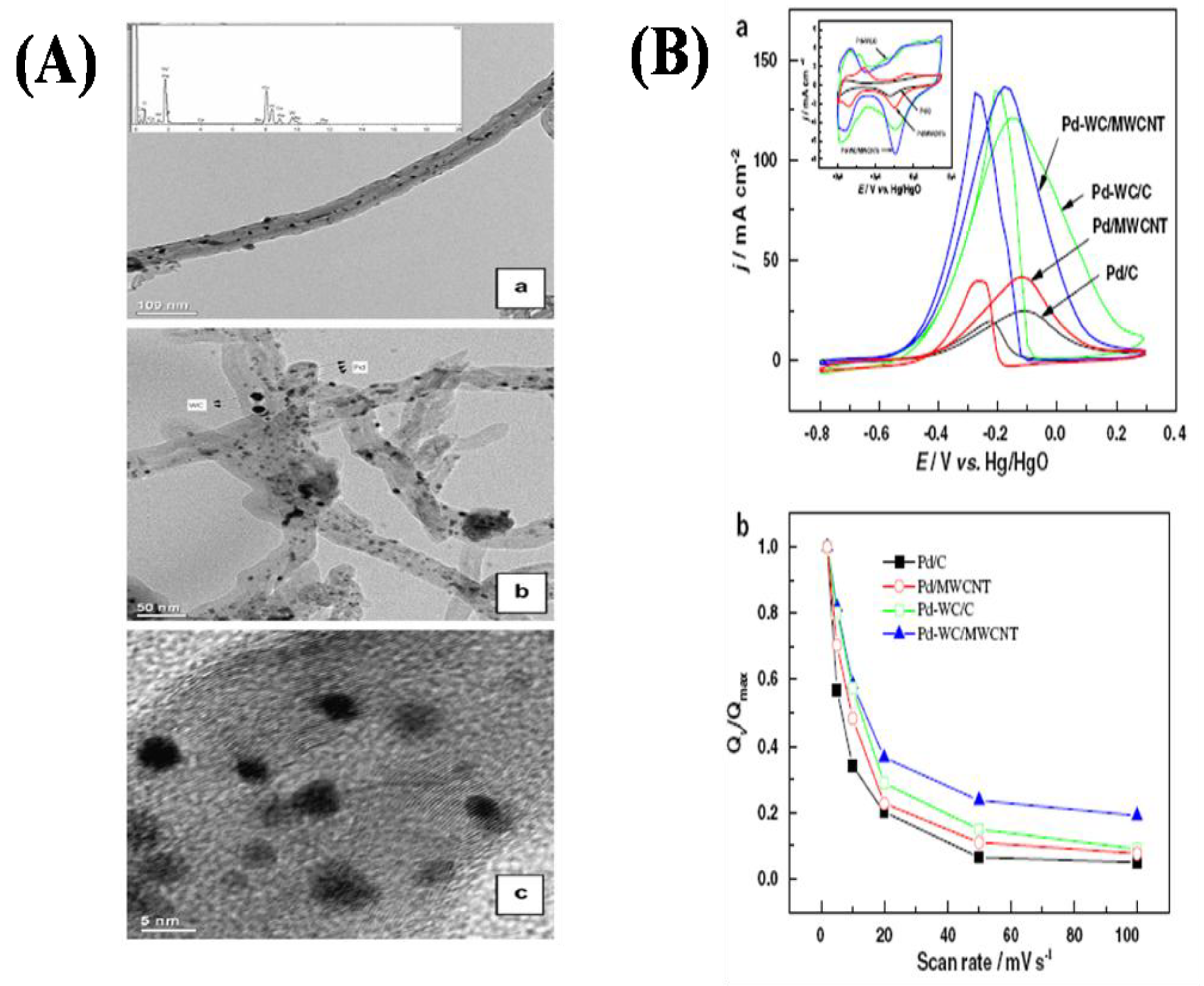 (A) TEM images of (a) WC/MWCNT, (b, c) Pd-WC/MWCNT and (B) the half cell results of various electrocatalysts for ethanol oxidation (Reprinted from Reference 96 with permission).