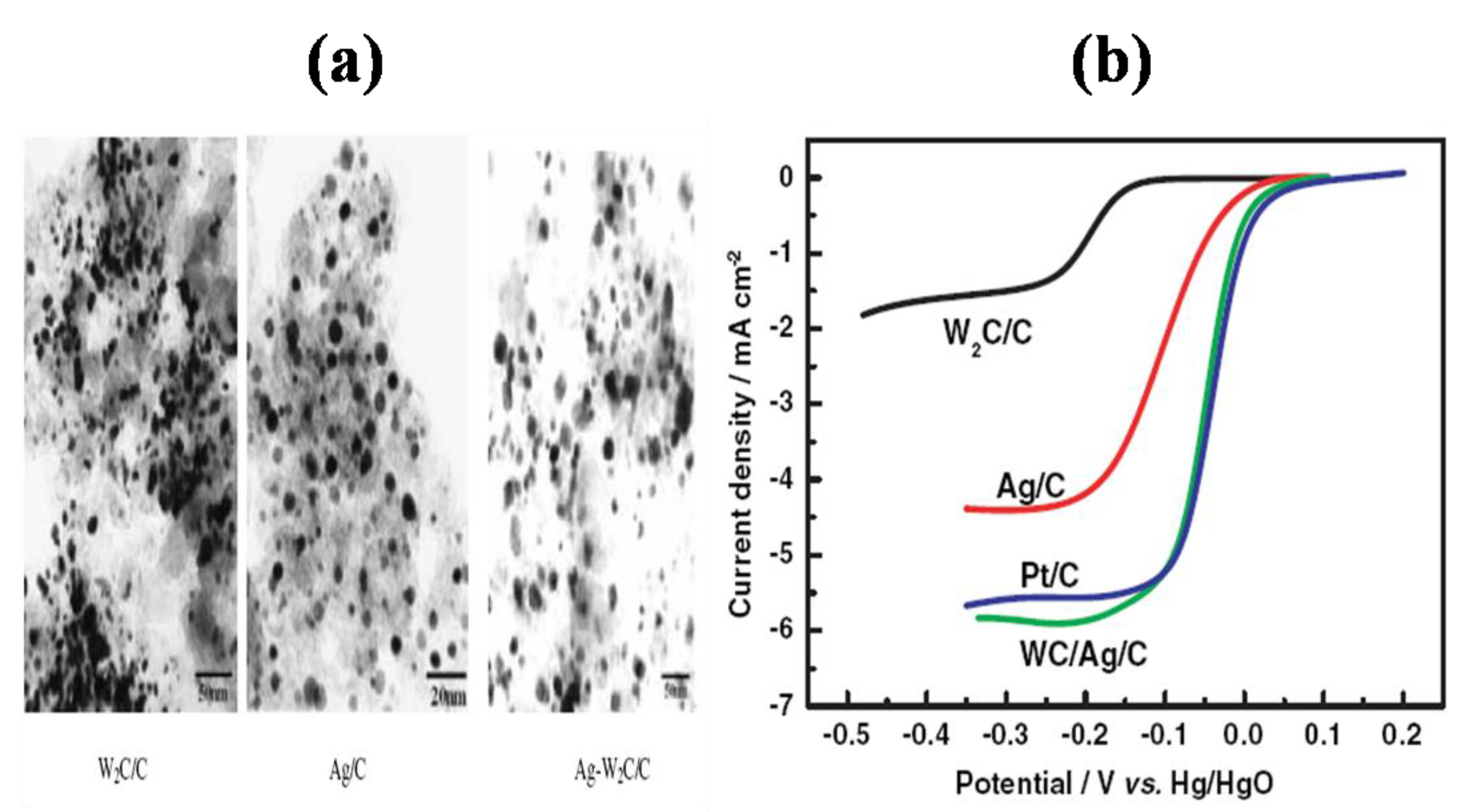 As other active tungsten carbide based electrocatalysts, Ag-W2C/C (Figure 11) [99], Pt-W2C(+WC)/C [100], AuPd-WC/C [101] showed higher cathodic onset potential, current density and Tafel slopes including higher exchange current density than those of Pt metal or Pt/C, which are state-of-the-art cathodic electrocatalyst. Especially, Pt-W2C(+WC)/C showed much better methanol resistance than Pt/C at cathode side of DMFC as shown in Figure 12. Only oxidation current was observed when methanol concentration was above 0.2 M, whereas reduction current was observed up to 0.5 M. Thus higher concentrations of methanol feed could be used as fuel.
