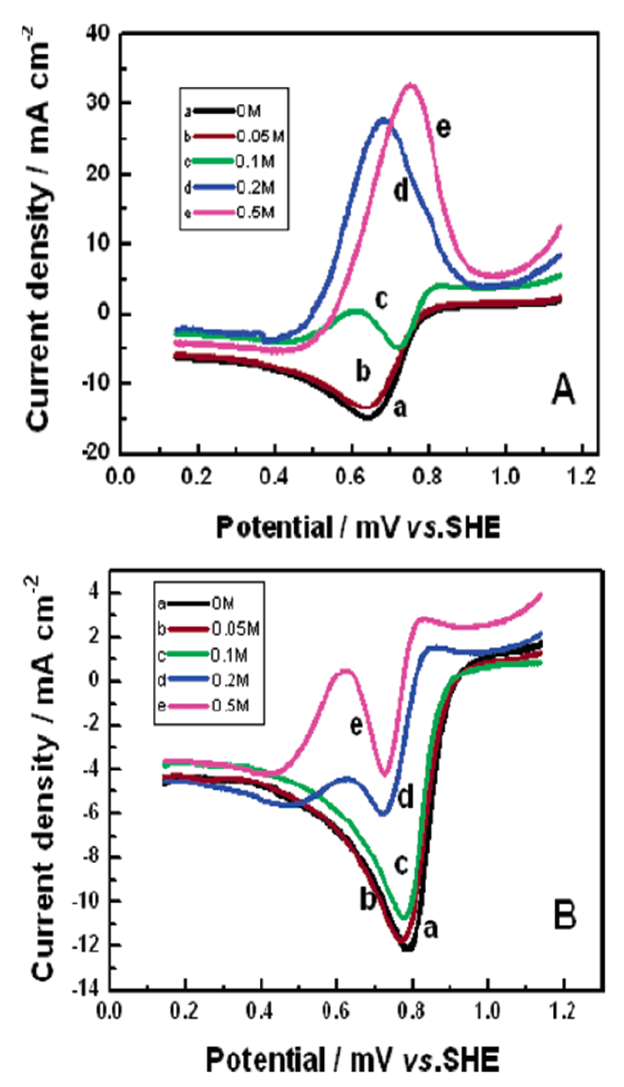 (A) CVs of ORR on Pt/C in an O2 saturated 0.5 M H2SO4 solution with different methanol concentrations (B) CVs of ORR on Pt-W2C/C at the same conditions (Reprinted from Reference 100 with permission).