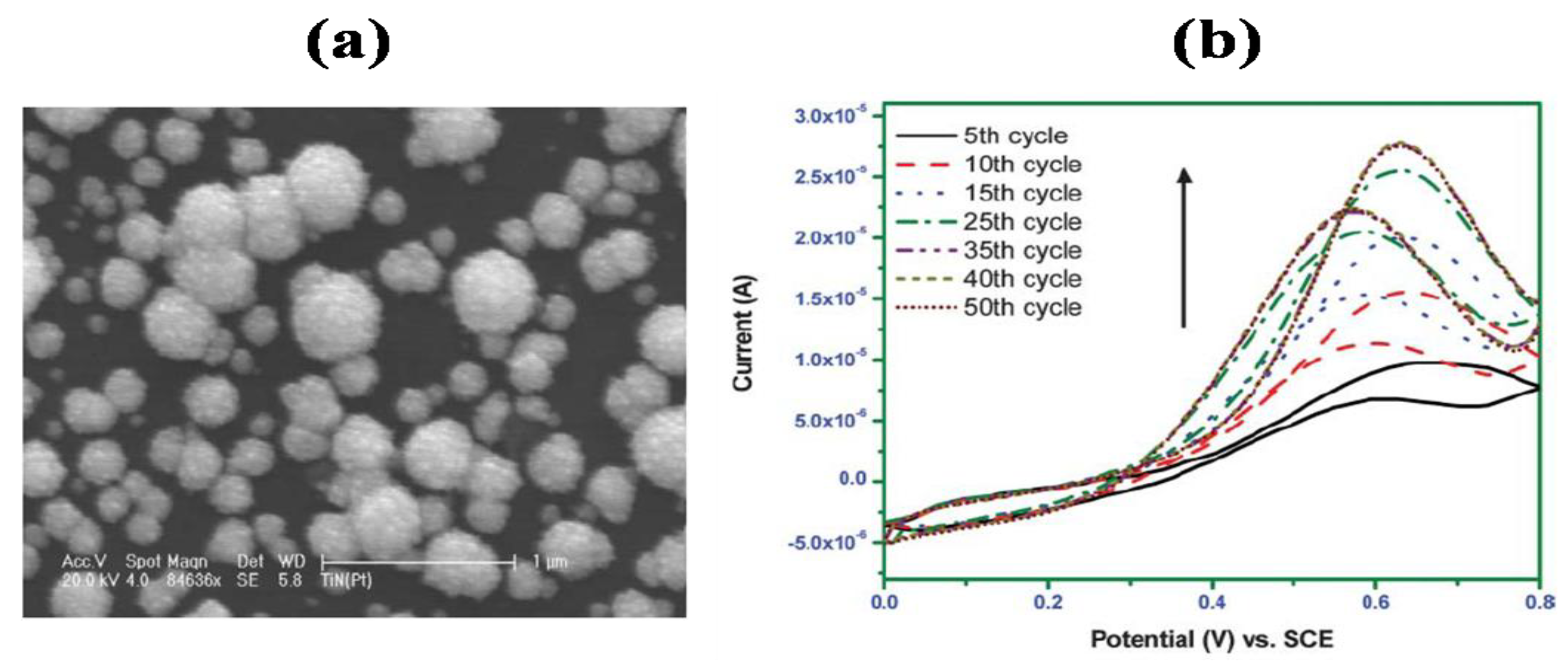 (a) SEM image and (b) Cyclic voltammograms of Pt–TiN for methanol oxidation in 0.5 M CH3OH and 0.5 M H2SO4 obtained by repeated cycles (Reprinted from Reference 111 with permission).