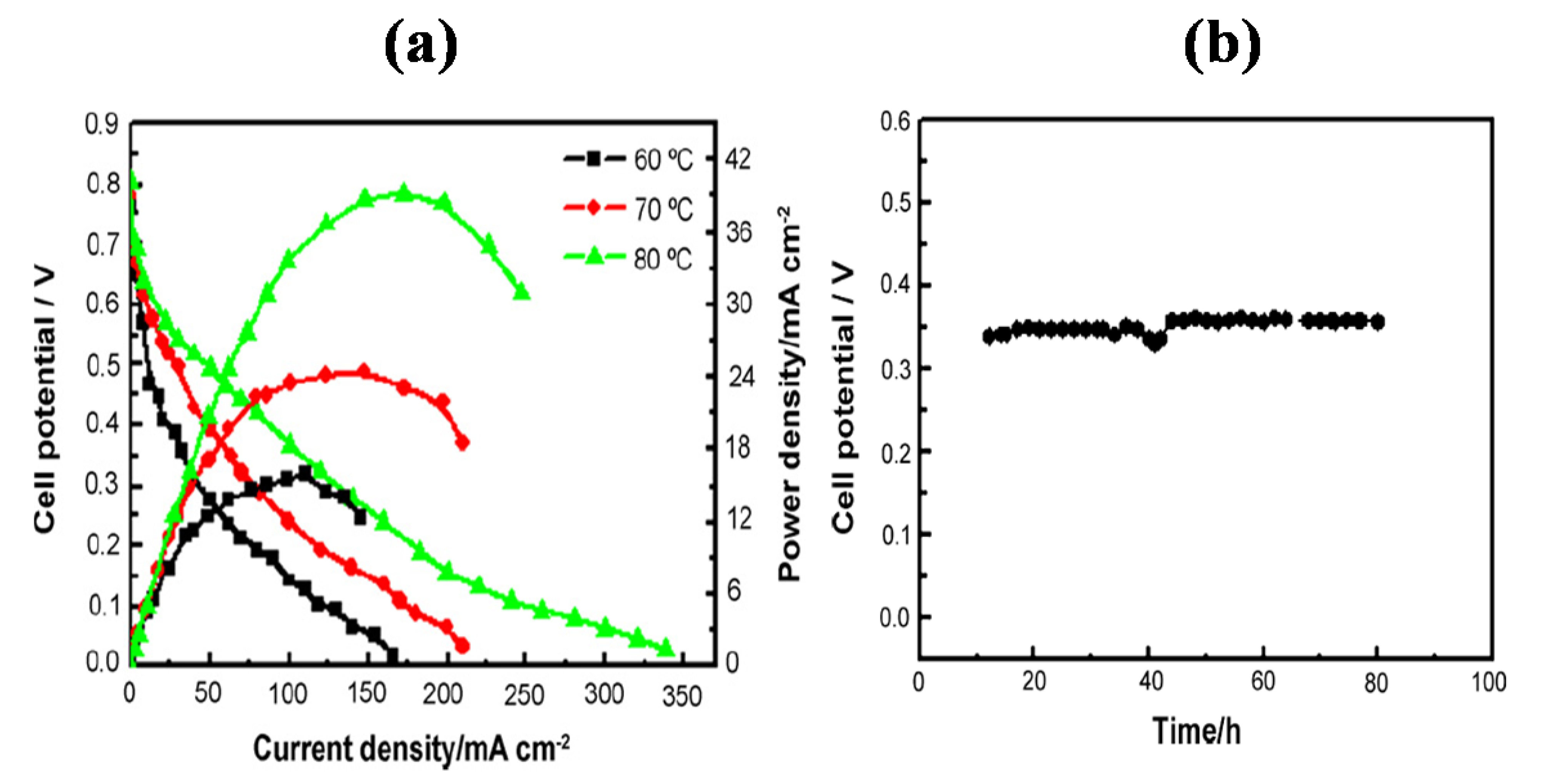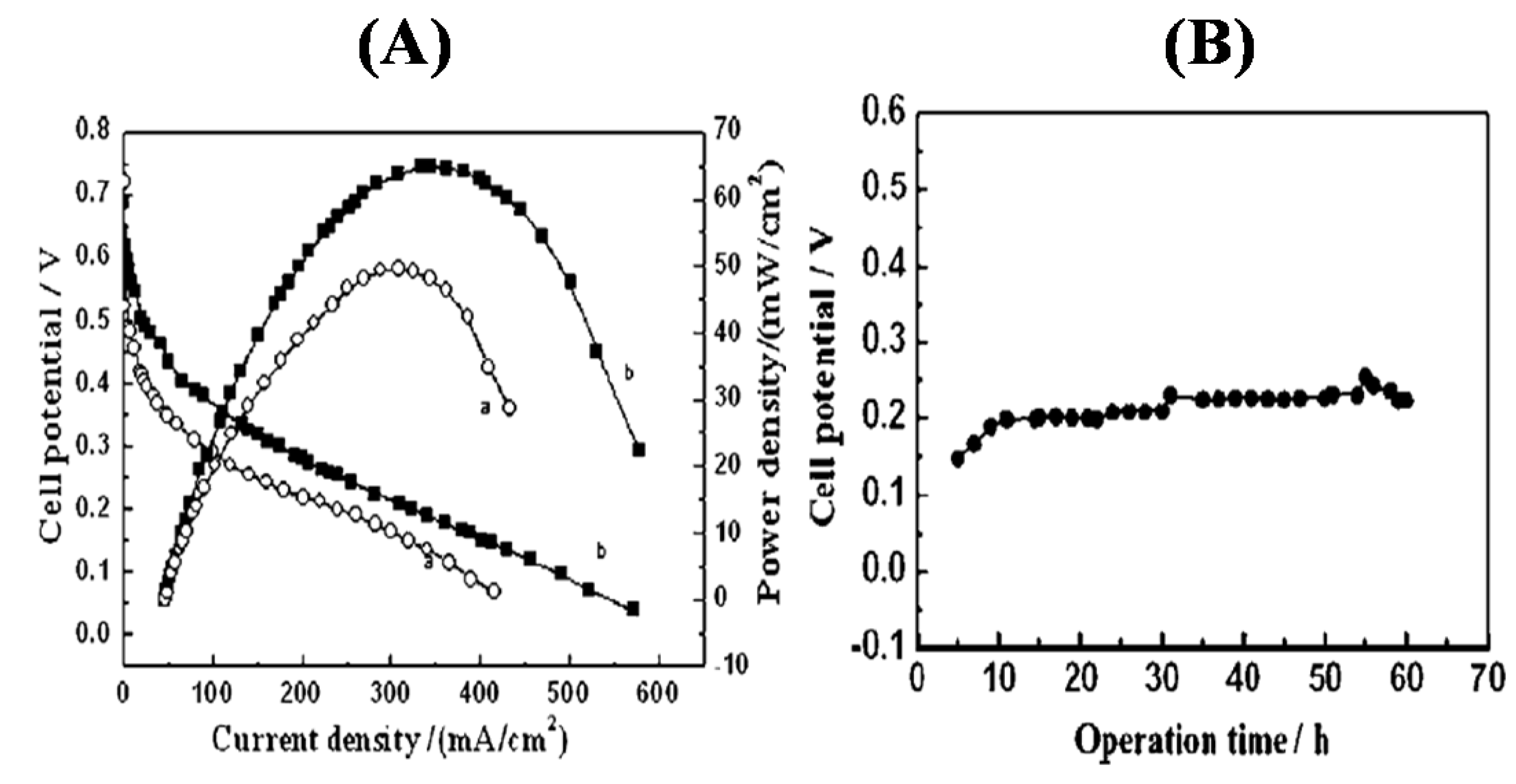 (A) Cell polarization curves of single cells with different cathode catalysts cathode: (a) 18 wt% Mo2N 0.609 mg/cm2; (b) 18 wt% Mo2N 1.165 mg/cm2. (B) Stability study for the Mo2N/C electrocatalyst cathode: 18 wt% Mo2N 0.609 mg/cm2. (Reprinted from Reference 113 with permission).
