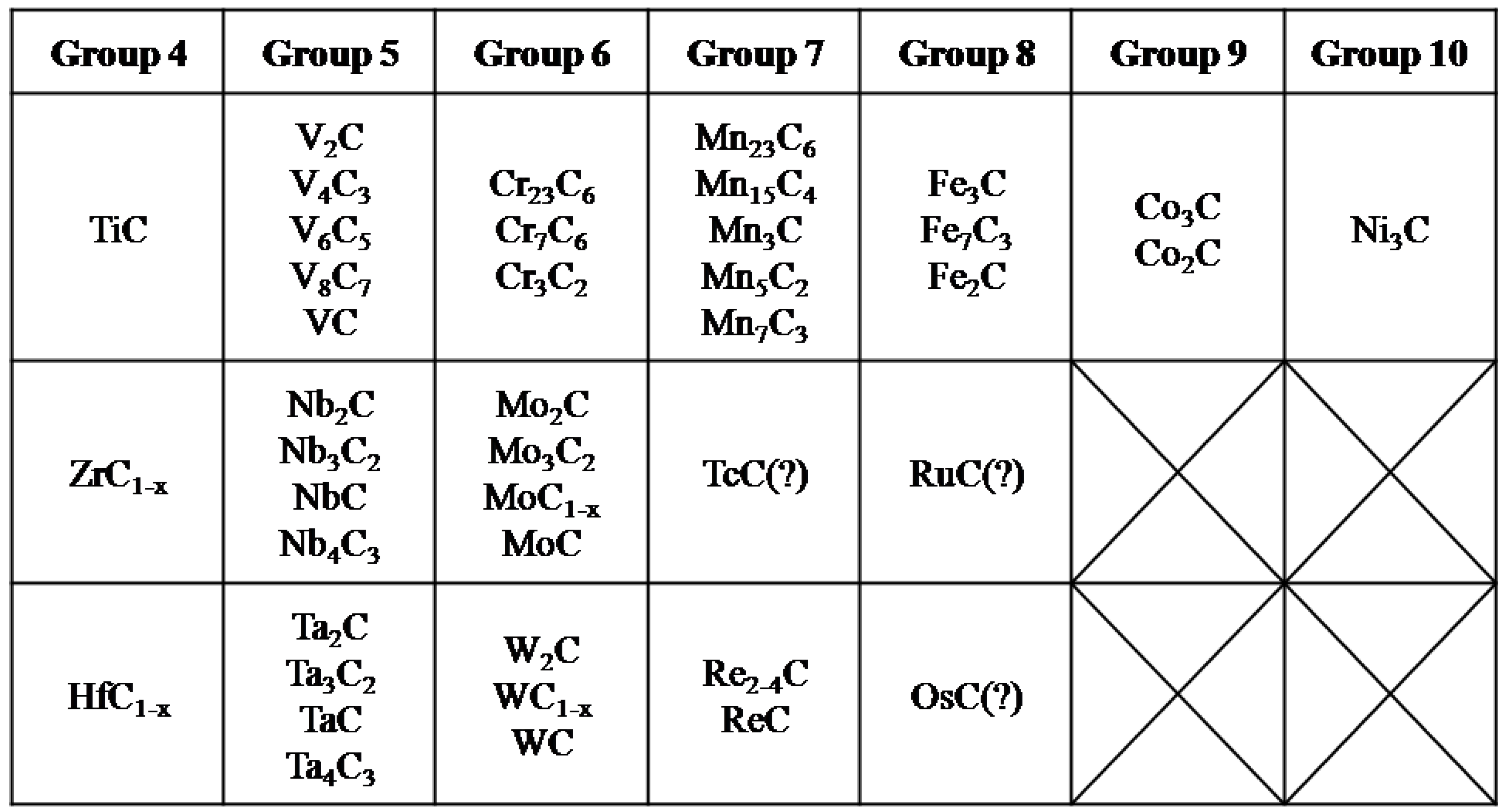 Transition metal carbides and their positions in the periodic table.