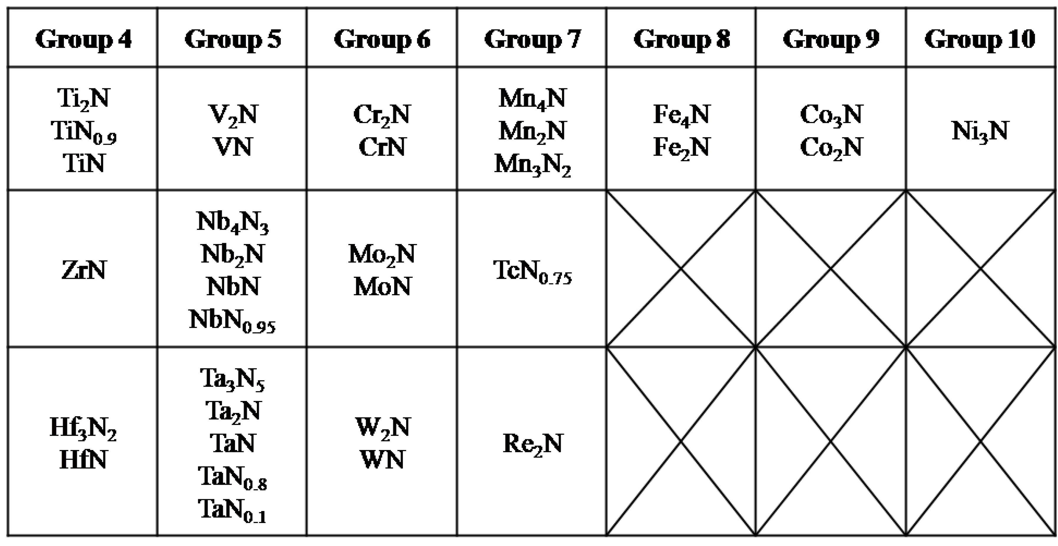 Transition metal nitrides and their positions in the periodic table.