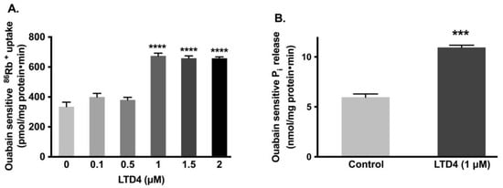 Effect of LTD4 (leukotriene D4) exposure for 24 h on Na-K-ATPase activity in IEC-18 cells. (A) Measurement of Na-K-ATPase activity by 86Rb+ uptake (n = 6, Dunnett’s multiple comparison test). (B) Measurement of Na-K-ATPase activity by Pi release in plasma membrane (n = 4, unpaired t-test). Values are represented as means ± SEM. *** p < 0.001, **** p < 0.0001 vs. 0 µM or control.