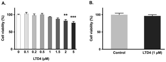Effect of LTD4 exposure for 24 h on cell viability. (A) Measurement of cell viability by MTT assay (n = 6, Dunnett’s multiple comparison test). (B) Measurement of cell viability by trypan blue assay (n = 6, unpaired t-test). Values are represented as means ± SEM. ** p < 0.01, *** p < 0.001 vs. 0 µM.