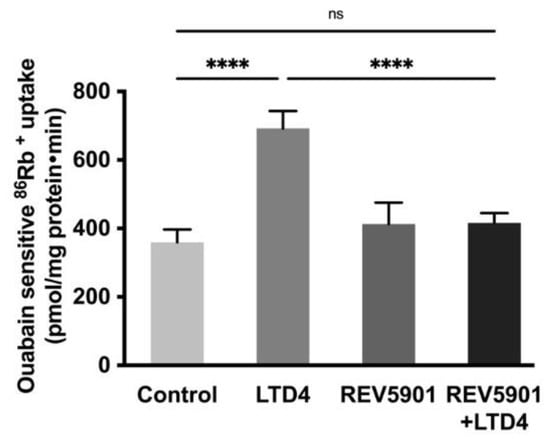 Effect of LTD4 receptor inhibitor REV5901 (5 µM) on Na-K-ATPase activity in IEC-18 cells after 24 h. Measurement of Na-K-ATPase activity by 86Rb+ uptake. Values are represented as means ± SEM (n = 6, Tukey’s multiple comparisons test). **** p < 0.0001; ns., not significant.