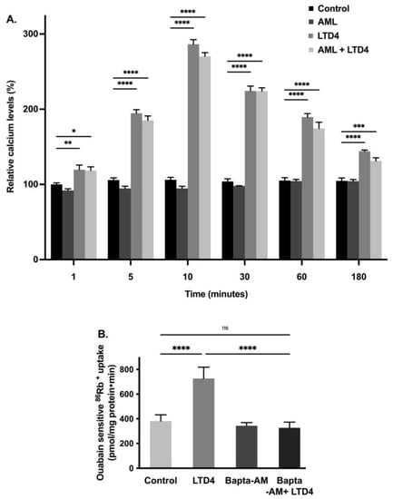 (A) Level of intracellular calcium at different time points during LTD4 treatment. Measurement of Ca2+ by Fluo-8 calcium flux assay. Values are relative to 1 min control (n = 8. Tukey’s multiple comparisons test). Control and amlodipine (AML, calcium channel blocker, 1 nM) alone did not change significantly at different time points. (B) Effect of calcium chelator BAPTA-AM (1 µM) on Na-K-ATPase activity in IEC-18 cells after 24 h. Measurement of Na-K-ATPase activity by 86Rb+ uptake (n = 6, Tukey’s multiple comparisons test). Values are represented as means ± SEM. * p < 0.05, ** p < 0.01, *** p < 0.001 vs. control and **** p < 0.0001 vs. control. ns., not significant.