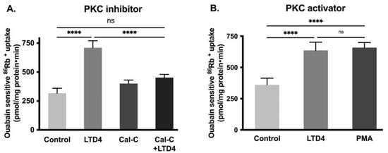 Previous studies have shown that PKC phosphorylates Na-K-ATPase subunits, which subsequently affects the activity of the Na-K-ATPase []. To see whether PKC mediates the LTD4 effect, cells were pretreated with the PKC inhibitor calphostin-C (0.1 μM) for an hour. After pretreatment, cells were treated with LTD4 for 24 h, followed by 86Rb+ uptake. Pretreatment with calphostin-C inhibited the LTD4-mediated stimulation of Na-K-ATPase activity (Figure 5A; control—317.3 ± 42.8, LTD4—710.3 ± 61.17, Cal-C—400.8 ± 30.14, Cal-C+ LTD4—452 ± 28.31 picomole/mg protein/min). Similarly, the PKC activator PMA (1 μM) also stimulated Na-K-ATPase comparable to LTD4 (Figure 5B; control—360.9 ± 53.12, LTD4—636.9 ± 65.51, PMA—659.3 ± 39.74). These data indicate that PKC mediates LTD4 stimulation of Na-K-ATPase in IEC-18 cells.