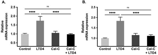 Quantification of Na-K-ATPase α1 and Na-K-ATPase β1 mRNA through quantitative real-time PCR (qRT-PCR) when treated with LTD4 and calphostin-C (PKC inhibitor) for 24 h. Values are relative to control and normalized to β-actin. (A) Na-K-ATPase α1. (B) Na-K-ATPase β1. Values are represented as mean ± SEM (n = 6, Tukey’s multiple comparisons test). **** p < 0.0001; ns., not significant.