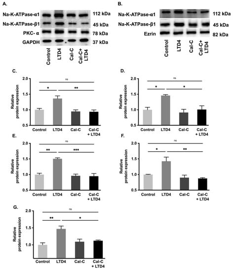 Quantification of Na-K-ATPase α1 and Na-K-ATPase β1 through Western blots when treated with LTD4 and calphostin-C (PKC inhibitor) for 24 h. (A) Representative Western blots of Na-K-ATPase α1, Na-K-ATPase β1, PKC-α and GAPDH (loading control) in whole cell lysate (WCL). (B) Representative Western blots of Na-K-ATPase α1, Na-K-ATPase β1, and Ezrin (loading control) in plasma membrane (PM). Densitometric quantitation of blots, (C) Na-K-ATPase-α1, (D) Na-K-ATPase-β1, (E) PKCα in WCL and (F) Na-K-ATPase-α1, (G) Na-K-ATPase-β1 in PM. Values are relative to control and normalized to GAPDH or Ezrin. Values are represented ± SEM, (n = 4, Tukey’s multiple comparisons test). * p < 0.05, ** p < 0.01; *** p < 0.001, ns., not significant.