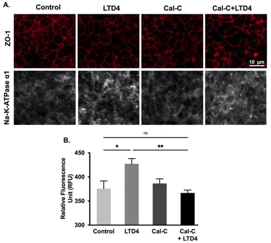 Quantification of Na-K-ATPase α1 through immunocytochemistry when treated with LTD4 and calphostin-C (PKC inhibitor) for 24 h. (A) Representative images of Na-K-ATPase α1 (gray), and ZO-1 (Red), (20×). (B) Quantification of Na-K-ATPase α1 (green channel). Values are represented as mean ± SEM, (n = 8, Tukey’s multiple comparisons test). *, p < 0.05, **, p < 0.01; ns., not significant.