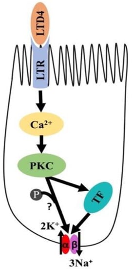 Arachidonic acid metabolites (AAMs) are prominent inflammatory mediators present in the mucosa of intestinal tissue from patients with IBD [,]. AAMs, specifically prostaglandin E2 (PGE2) and leukotriene D4 (LTD4) have been associated with the pathogenesis of several diseases including rheumatoid arthritis, asthma, psoriasis, multiple sclerosis, and IBD. It has been reported that LTD4 has also been associated with inflammatory processes [] as well as intestinal secretion []. In various human cells and tissues, LTD4 through CysLT1R increase [Ca2+]i and phosphatidylinositol (PI) metabolism activates MAPKs (Mitogen-activated protein kinases), induces cell proliferation and differentiation, actin reorganization, chemotactic migration, release of various inflammatory mediators, and regulation of hematopoietic stem cells mobilization []. LTD4 has also been involved in the stimulation of SN2 and Na-K-ATPase in IEC-18 cells []. However, the molecular mechanisms responsible for the stimulation of Na-K-ATPase by LTD4 in crypt cells during IBD have not been determined.