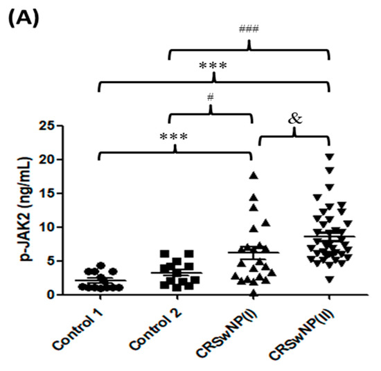 In our previous study, we investigated the members of JAKs phosphorylation, such as p-JAK1, p-JAK2, and p-JAK3 by ELISA. Our preliminary data showed that the p-JAK2 level in patients’ NP tissue of CRSwNP was higher than in a control; however, there was no significant difference of p-JAK1 or p-JAK3 between each group with our collected subjects (control and CRSwNP). Therefore, in the present study, we investigated the JAK2-associated cytokine expression and JAK2-mediated STATs signaling phosphorylation in control and CRSwNP samples, as well as assessing their relationships with disease severity. The results may expand our understanding of JAK2-relevant signaling mediated by the JAK2-associated cytokines in CRSwNP of the Taiwanese population.