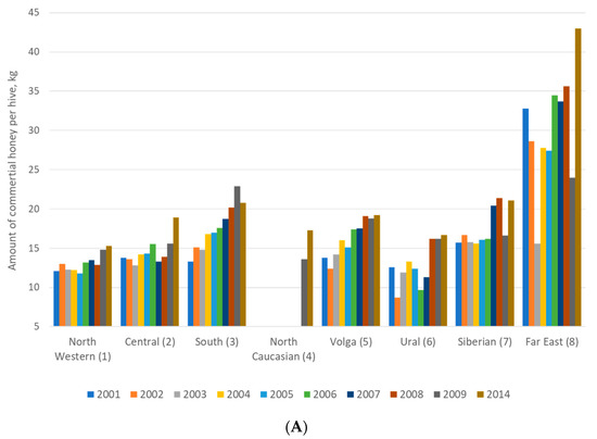 Researchers and beekeepers conduct the identification of honey bees by behavioral traits (aggressiveness, overwintering and swarming) and productivity traits at the colony level [91,92,93]. Aggressiveness has been defined by Russian beekeepers according to the reaction of the honey bees to the opening of the hive. Furthermore, it has been tested by determining positions of the bees on the honeycomb during inspection. Overwintering is the most important period for the survival and development of honey bees [94]. Swarming is a complex and labor-intensive processes occurring in apiaries which leads to the loss of honey bee colonies [95]. Beekeeping and management depend on the tendency of honey bee colonies to swarm. Swarming is one of the traits used in the description of new types or subspecies of honey bees. Many behavioral traits (swarming, aggressiveness, and others) are used to characterize colonies of honey bees [96], and this is conveniently applied by beekeepers. The best productivity of honey reported in the Russian Federation districts was presented in the Far East (Figure 3A). However, the number of honey bee colonies in the Far East was not great. Therefore, when there are fewer colonies in an environment that offers resources for bees, a smaller number of colonies may gather relatively more nectar and therefore produce more honey (Figure 3B). Hence, the performance of honey bees in the Far East was excellent.