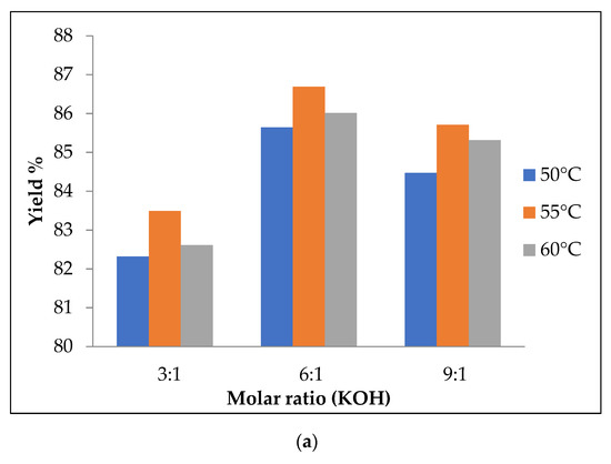 Figure 4a,b depict the obtained PKO biodiesel yield for different molar methanol-to-oil ratios for a reaction time of 45 min, using KOH and NaOH as catalyst, with 3 different temperatures (50, 55 and 60 °C). For the molar ratio of 3:1, the biodiesel yield for both KOH and NaOH catalysts was lower, due to the insufficient methanol level in the oil for the reaction. The maximum yield of PKO biodiesel was obtained at the molar ratio of 6:1 with the temperature of 55 °C (Table 3) for the KOH (86.69%) and NaOH (75.21%) catalysts. From the results, the biodiesel conversion was more effective in the methanol level of 6:1, as can be also observed from the Figure 4. The biodiesel conversion was decreased with further increase in the molar ratio (i.e., 9:1), probably because of the fact that glycerol separation from biodiesel fraction is very hard. This is due to the high glycerine solubility that affects the settling of glycerine, thereby decreasing the biodiesel yield [25]. It is observed, from Figure 4, that the KOH catalyst had a higher biodiesel yield, compared to the NaOH catalyst, due to the higher glycerol separation.