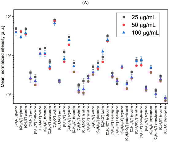 A similar analysis was performed for measurements carried out in negative polarization. Figure 5B shows a plot of the mean normalized intensities for all characteristic ions for the LACT protein, for which the one-way ANOVA analysis showed statistically significant differences between the results for the three concentrations considered. For 38 masses corresponding to the characteristic ions in the negative polarization, in most cases, similarly to the positive polarity, higher intensities were obtained at the lowest concentration (25 µg/mL). The trend was different only for seven of the presented masses where, for [C2H2O2]− (arginine), [C3H3O3]− (serine), [C5H7O4]− (asparagine), [C5H11N2O2]− (arginine), and [C6H13N4O2]− (arginine), higher intensities were obtained for 50 µg/mL while, for the remaining ions characteristic of cysteine (i.e., [C4H8NO2]− and [C9H11N4O4]−), the highest values were obtained for 100 µg/mL. The results for this ionic polarization were consistent with the results obtained for the positive polarization as, in both cases, for a significant number of characteristic peaks, the highest intensities were found for the lowest concentration. This may mean that the LACT protein, composed of the analyzed amino acids, most effectively binds to the previously functionalized APTES/GA silicon surface at a concentration of 25 µg/mL.