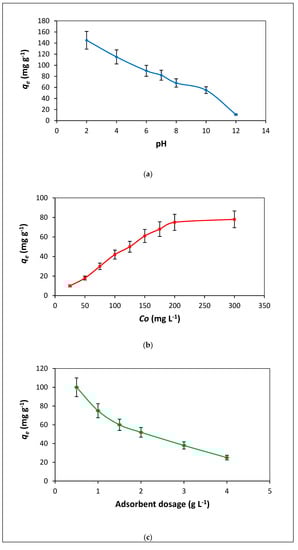 The adsorption capacity of CV dye initial concentration has profound influence on NIFGS. The increase in the initial dye concentration from 25 to 300 mg L−1 onto NIFGS increased from 10 to 78 mg g−1. The adsorption of NIFGS related to the concentration gradient has a driving force on the dye adsorption (Figure 2b). The adsorption of CV was more with a higher concentration and reached almost constant after attaining equilibrium [37].