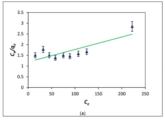 Langmuir [30] proposed a model on the assumption that the adsorbent has active sites possessing almost uniform energies. This was further established on the idea that no lateral interaction takes place between adsorbed molecules. A plateau in a two-dimensional graph with equilibrium concentration (Ce) as the independent variable and qe as the dependent variable characterizes that spontaneous surface sites of adsorbent are almost fully saturated. This implies that further adsorption cannot take place and the possibility of multilayer adsorption of the dye is ruled out. The equations of the Langmuir isotherm model are shown in Equations (4) and (5), Table 1. The Langmuir isotherm parameters, qmax and b tabulation involves the slope (1/qmax) and intercept (1/bqmax) of the graph Ce/qe versus Ce as shown in Figure 3a.