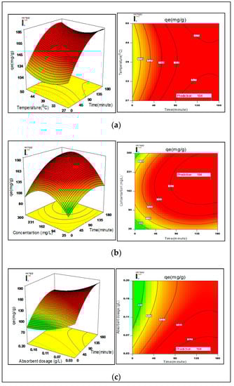 A 3D-surface plot and 2D-contour plot representing adsorption capacity variation relative to: (a) duration vs. temperature, (b) duration vs. concentration, (c) duration vs. adsorbent quantity and (d) duration vs. pH.