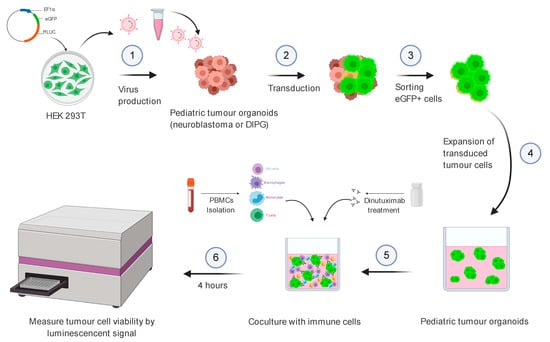 Schematic representation of study design and experimental workflow. Paediatric tumour organoids (neuroblastoma and DIPG organoids) were transduced with a lentiviral vector carrying eGFP-ffLuc fusion reporter genes. eGFP expressing cells were sorted and expanded for coculture assays. Paediatric organoids were cocultured with allogenic PBMCs with/without dinutuximab treatment. The tumour cell viability was measured using the ADCC luciferase assay after the administration of D-Luciferin.