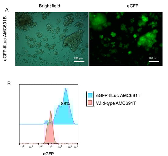 A key advantage of our method is that the lentiviral transduction protocol used leads to efficient, stable transgene expression, and that successful transduced primary paediatric tumour lines can be generated and stored. Our protocol further used serum-free culture conditions, while other protocols use either serum-rich or serum-reduced medium []. Patient-derived organoids are preferably cultured in animal serum-free medium with defined recombinant growth factors because the presence of serum and undefined growth conditions may contain differentiation factors causing growth arrest related to differentiation for some neuronal cultures. In addition, instead of using ultracentrifugation to concentrate the lentiviral stock, we used Lenti-X Concentrator as a faster and more efficient method to enhance the lentiviral titer by up to 100-fold in less than 1 h. Another difference is that our protocol utilizes cell sorting to enrich the high-expressing population of transduced tumour cells. Since the expression of firefly luciferase is linked to eGFP expression, the expression of luminescence signals and the expression of firefly luciferase can be controlled by selecting and sorted cells with the desired intensity of eGFP expression. In addition, since the promoter EF1 is a human-derived promoter, it has a minimal chance of gene silencing compared to other promoters used in other protocols. In terms of transduction efficiency, here, to the best of our knowledge, efficient lentiviral transduction of NB organoids has not been reported before. For DIPG, the yields obtained here were found to be significantly greater than those reported in past studies using similar primary/patient-derived paediatric tumour organoids [].